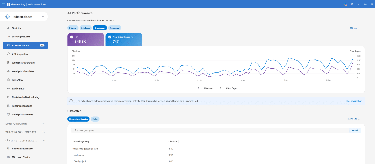När det kommer till att mäta synligheten i AI-söket har vi famlat lite i blindo då det inte har funnits några riktiga data att luta sig mot. Hur ofta syns webbplatsen? Vilka frågor genererar svar där innehållet används som källa? Medan Google har varit relativt tysta om data för AI Overviews, har Microsoft nu tagit ett kliv framåt. Den 10 februari 2026 lanserades en betaversion av Bing Webmaster Tools med data för AI Performance.